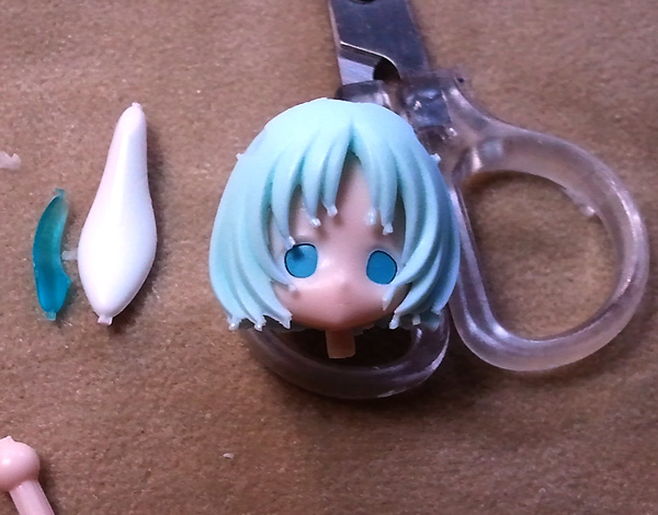 フェイスパーツ、前髪、アクセサリーパーツの余分なバリを削って整えます。